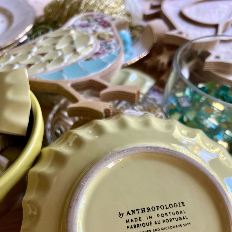 I have limited availability of some material (such as the discontinued buttery hued Anthro bowl- colors subject to change!).